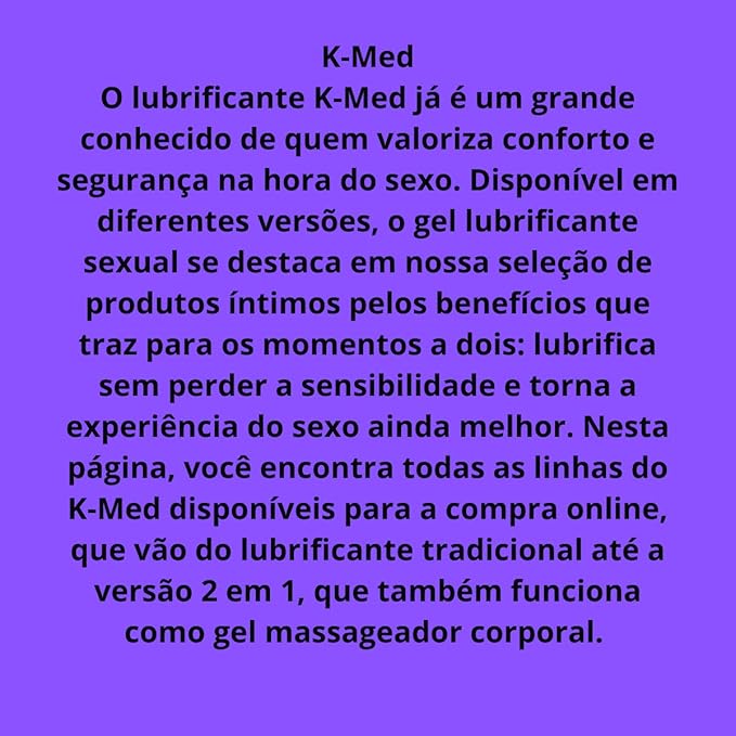 O K-MED é um gel neutro especialmente desenvolvido e é indicado para uso como lubrificante íntimo nas relações sexuais adois.